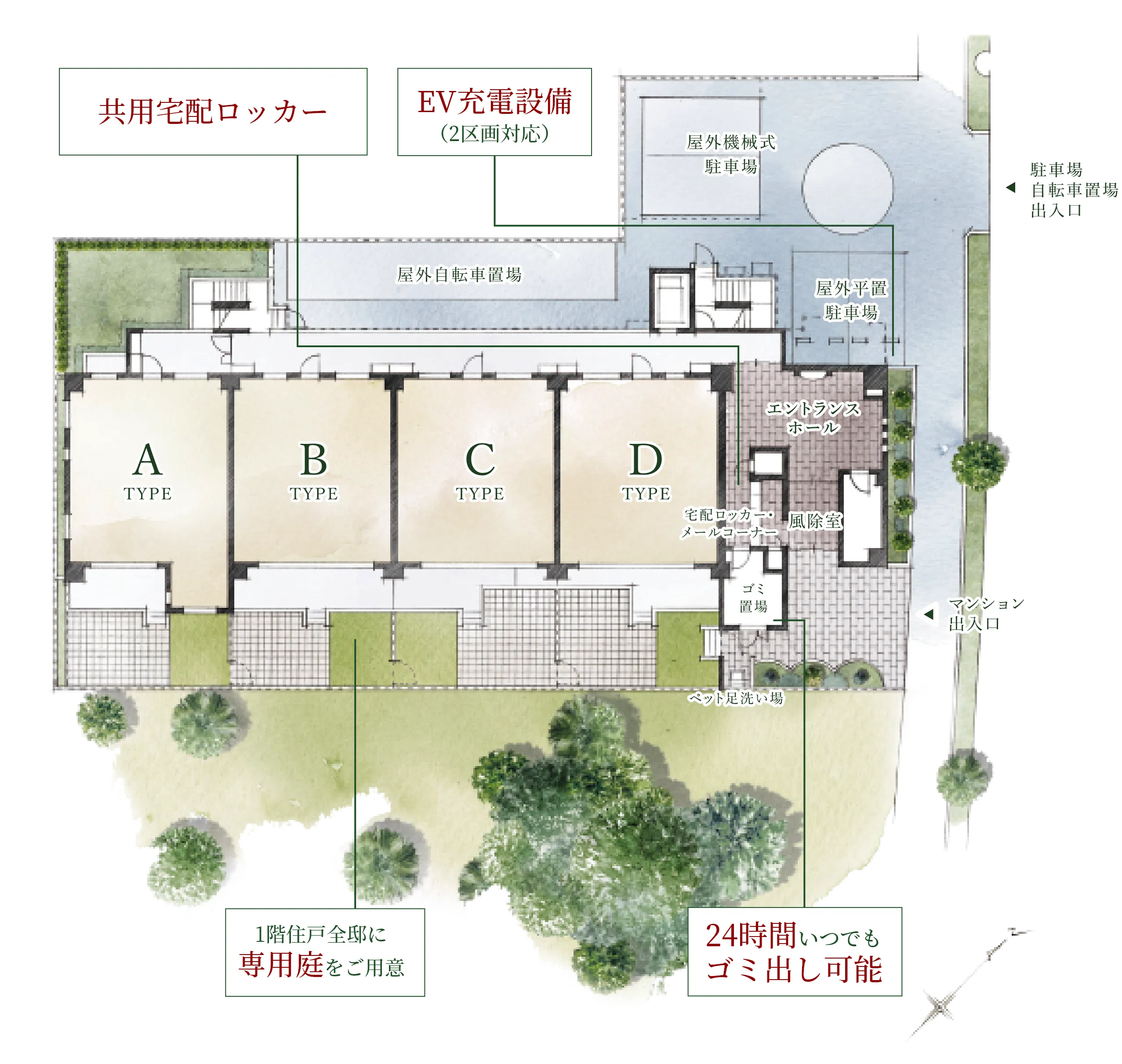 ※敷地配置イラストは計画段階の図面を基に描き起こしたもので、官公庁の指導、施工上の都合により建物の形状、色調、植栽等に変更が生じる場合がございます。