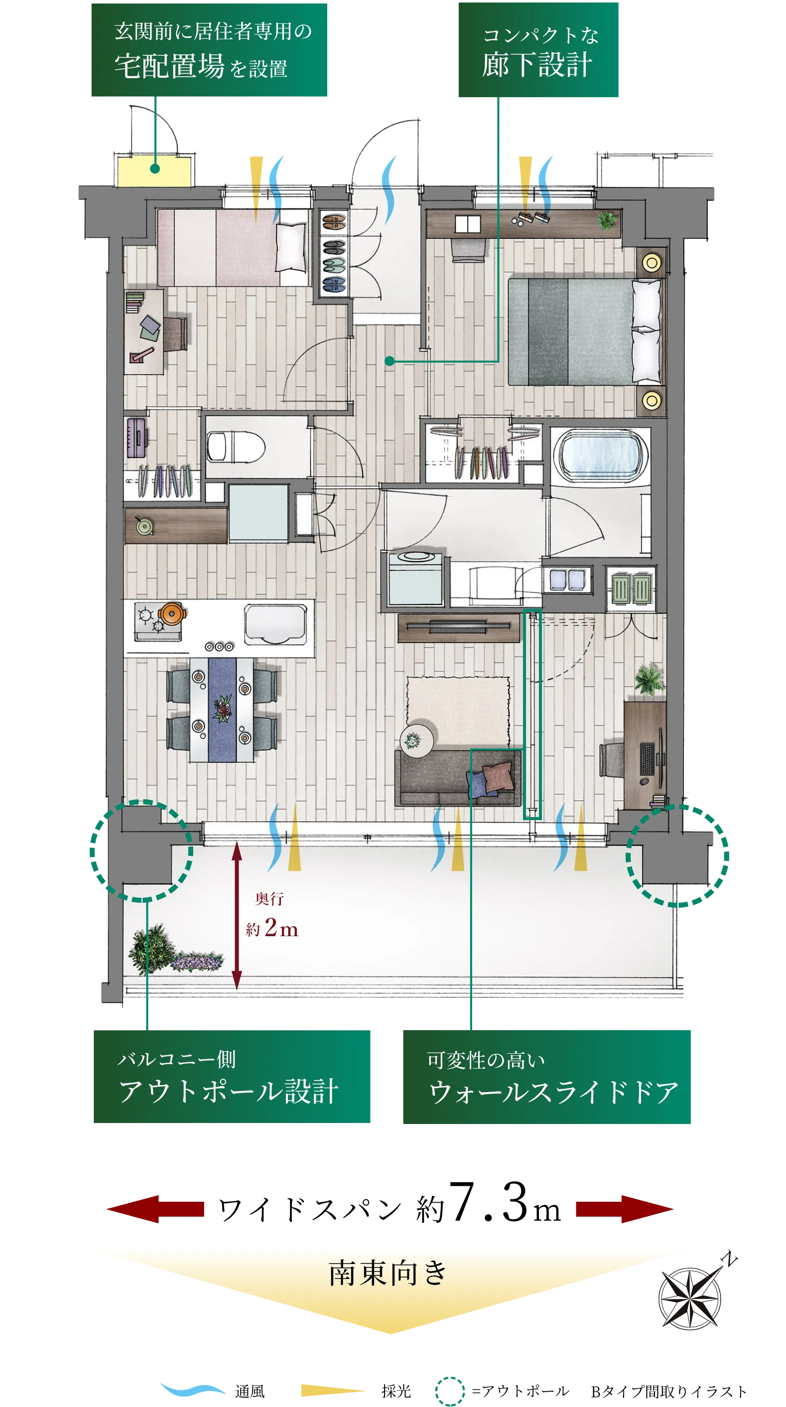 すべての住まいを南東に向け、やわらかな光を受けとめる。居室やバルコニーの横幅をゆったり確保したワイドキューブプランが、丘の上のテラスにふさわしいのびやかな空間を演出します。