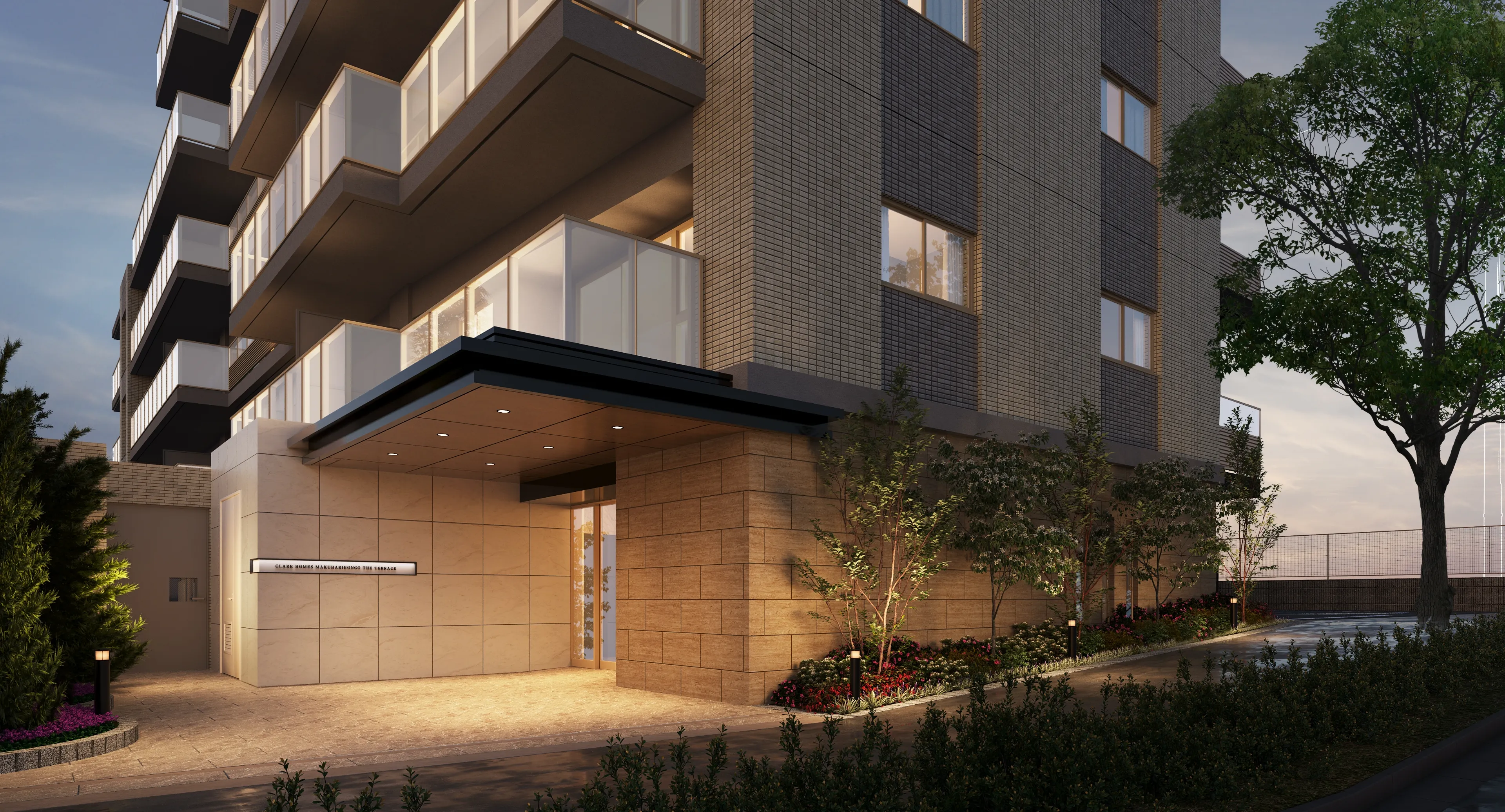 ※掲載の外観・エントランス完成予想CGは、設計図面を基に描き起こしたものであり、施工上の都合により、建物の外観・仕様・色彩・植栽などに変更が生じる場合がございます。また外観形状を分かりやすくするために、近隣施設及び建物を一部透かしている部分があります。植栽につきましては特定の季節の状況を表現したものではなく竣工時には完成予想図程度には成長しておりません。