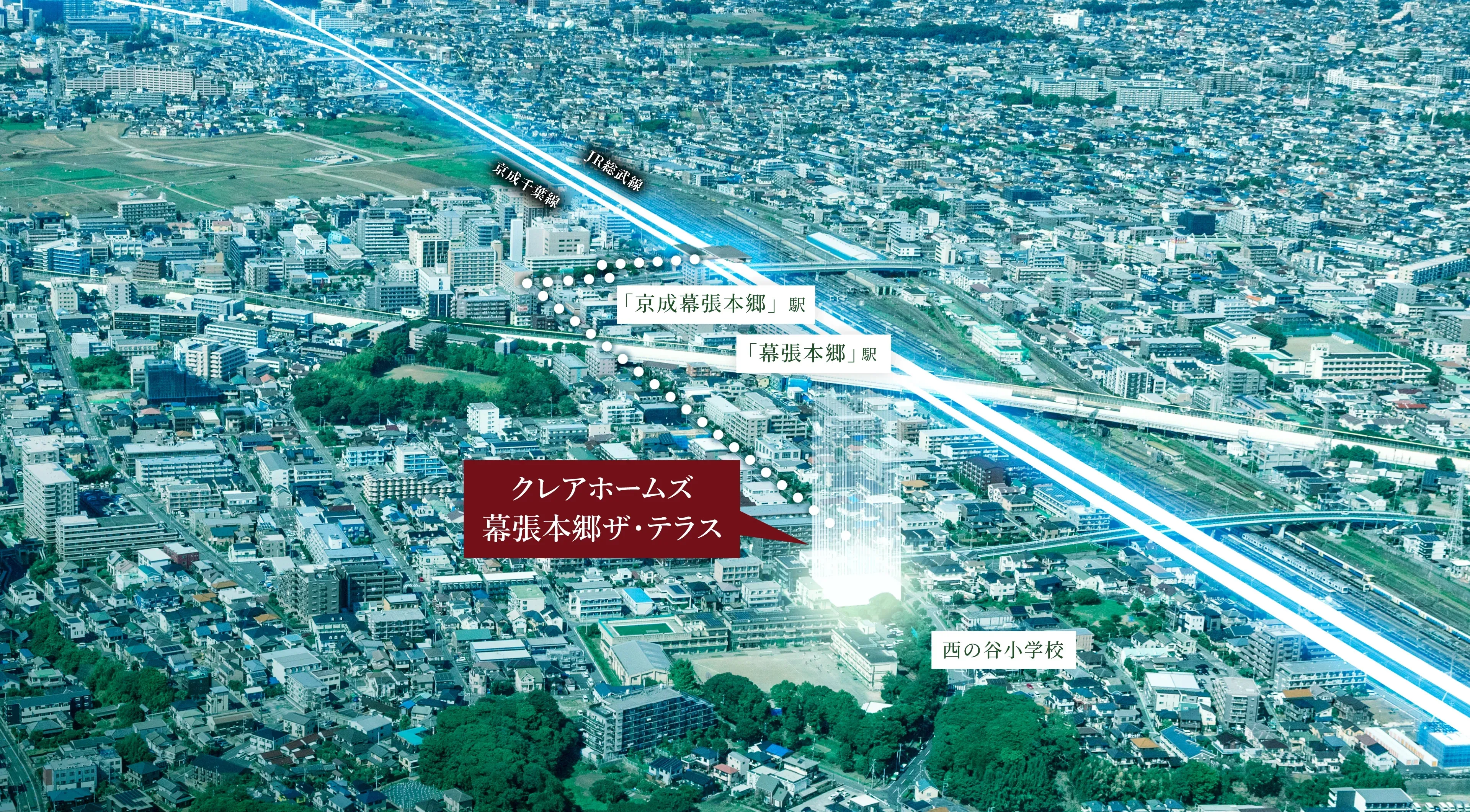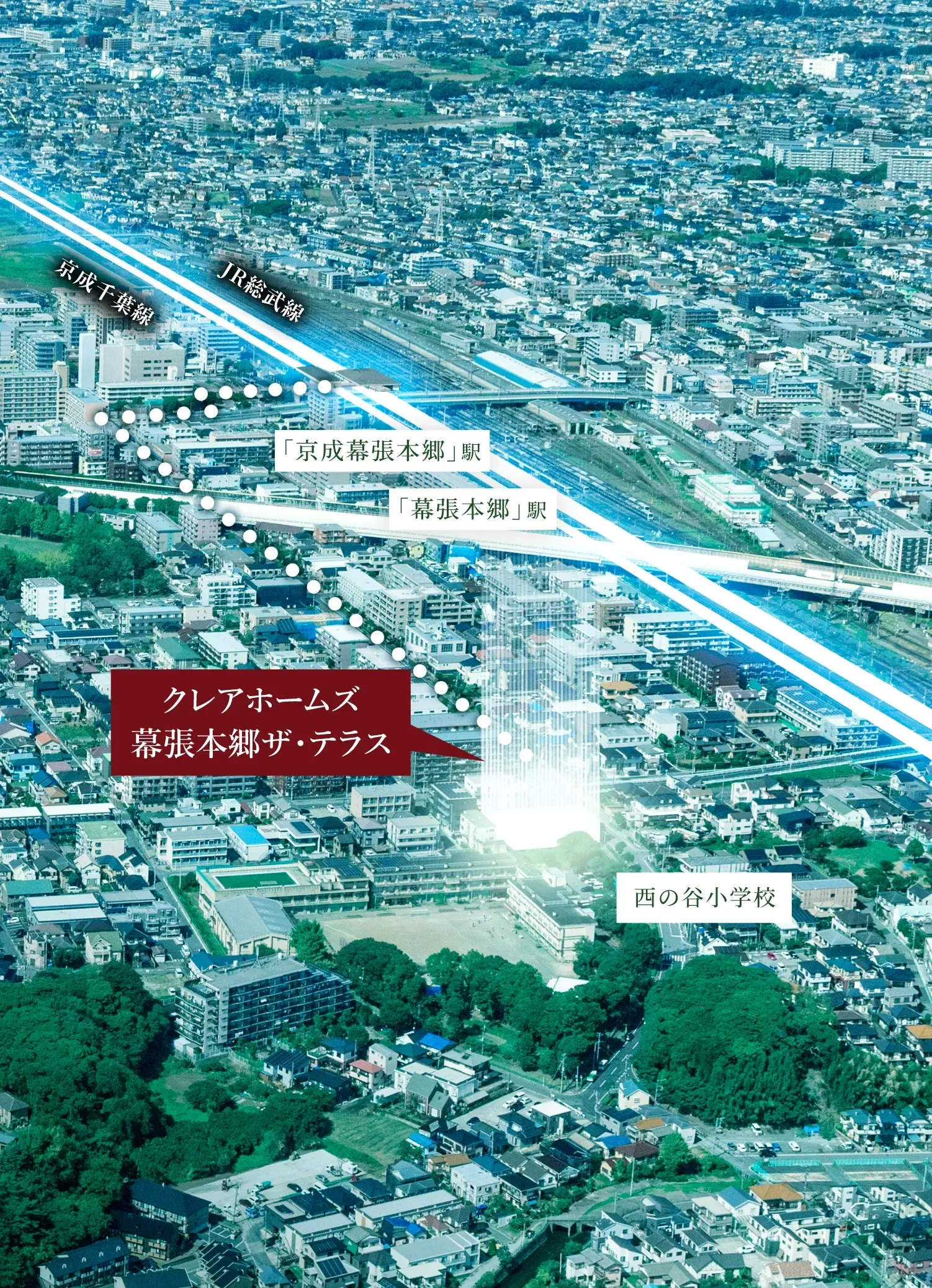 JR総武線と京成千葉線の2駅2路線が利用できる幕張本郷。その南側、海浜幕張を間近にした下総台地の高みに、本物件は誕生します。ここは、華やぎの先にあるもう一つの幕張です。
